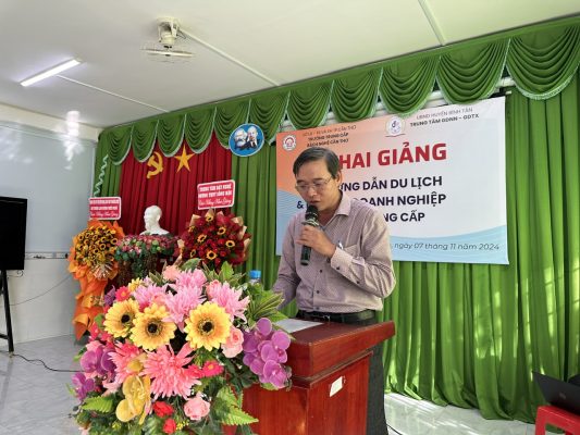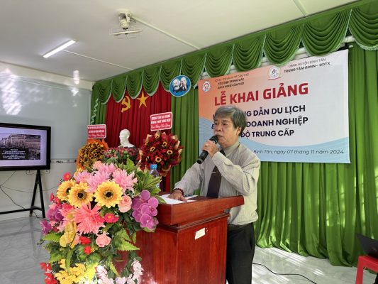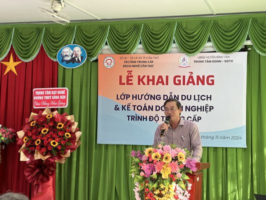 Ông Nguyễn Đình Mãnh – Hiệu trưởng nhà trường có bài phát biểu nêu lên ý nghĩa và mục tiêu đào tạo lớp trung cấp Hướng dẫn du lịch và lớp Kế toán doanh nghiệp theo Nghị định 81/2021 và Nghị định 97/2023 của Chính phủ, đáp ứng nguồn nhân lực chiến lược phát triển huyện Bình Tân, và tuyên bố khai giảng.