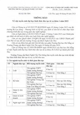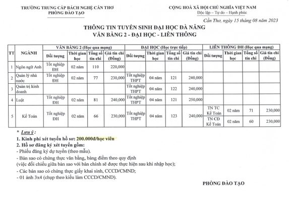 Trường Trung cấp BÁCH NGHỆ Cần Thơ liên kết với Đại Họ ĐÀ NẴNG chiêu sinh các lớp liên thông đại học và văn bằng 2 cho các ngành nghề: